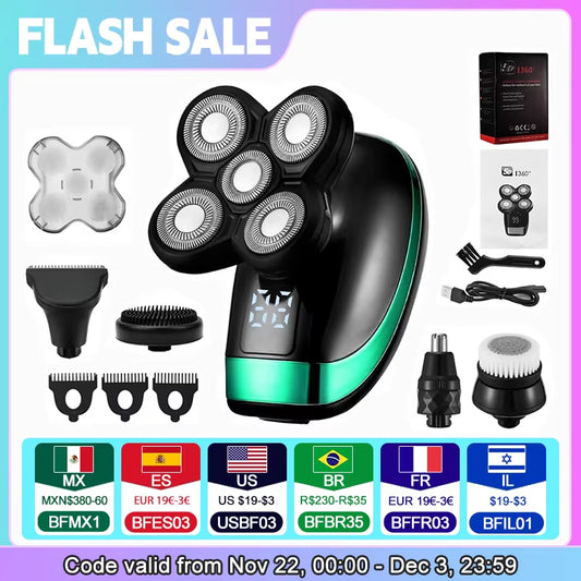 5 in 1 4D Men'S Rechargeable Bald Head Electric Shaver 5 Floating Heads Beard Nose Ear Hair Trimmer Razor Clipper Facial Brush