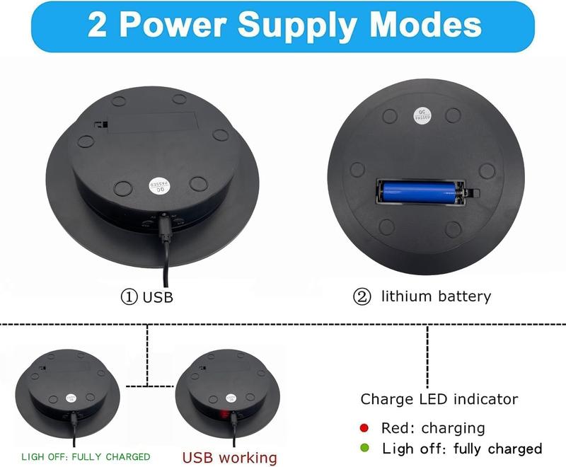- 【Three Power Supply Modes are Available】: Electric Display Stand is for USB direct plug AC power supply, USB power bank power supply, and rechargeable battery power supply. The size of the turntable is 5.75" x 5.75" x 1.38", and the maximum load-bearing capacity is differentiated according to the rotation speed.