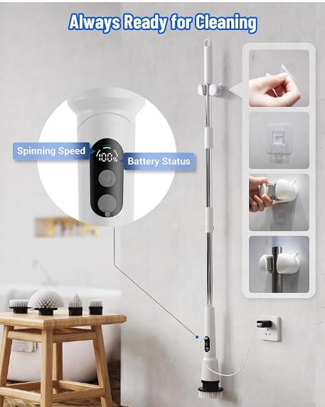 - 【9 Multi-functional Cleaning Brush Heads】- Our Electric Shower Scrubber comes with a wealth of accessories: 8 interchangeable cleaning brush heads and 1 crevice cleaning 、 brush, perfect for those tight and hard-to-reach spots. Plus, we throw in a USB charging cable, a free hook, and a brush head storage bag to keep everything neat and tidy.