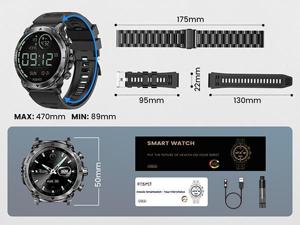 - [Two Straps, Two Styles] LGW6 is a brand new smart watch for men from FOSMET that combines design and functionality. The smartwatch not only replaces the traditional watch to fulfill daily needs, but also comes with functions such as health detection, etc. LGW6 adopts 1.43” ultra-high-definition seamless screen with 3 buttons and 1 crown, and is equipped with stainless steel and black silicone band. Stainless steel strap is more suitable for work or daily use, exquisite design shows men's taste, silicone strap is more suitable for sports, comfortable and lightweight does not bring any burden to the movement. Two watch straps, two styles, well-designed smartwatch for men.