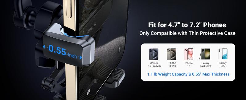 - Max Weight Capacity: 17.6 oz/ 500g. This car vent phone mount fits for 4.7" to 7.2" cell phones and supports Max 0.55-inch thickness for phone with case.