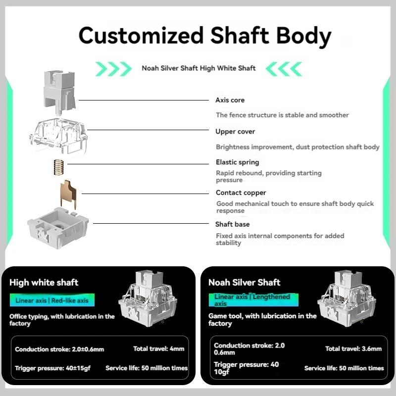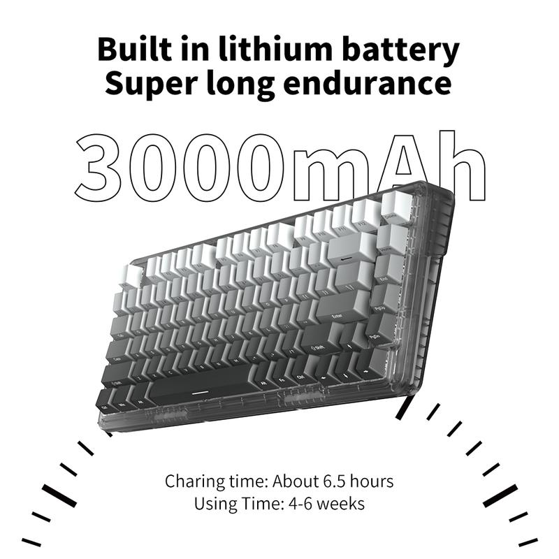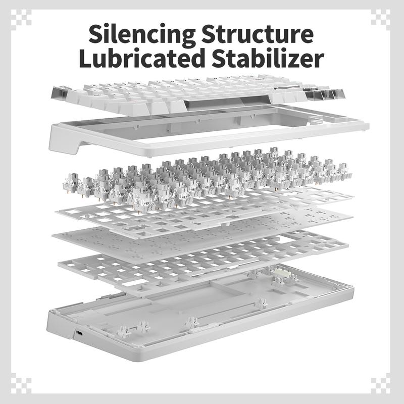 3.Supports hot-plugging of all keys.Sandwich cotton + bottom cotton + under-axis pads, of which the sandwich cotton and bottom cotton for PORON; enrich the internal space of the keyboard, so that the cavity sound and vibration of the hands become smaller, more solid feel.